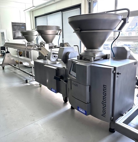 Вакуумный шприц Handtmann VF-620 с линией набивки сосисок PVLH-228.В системе PVLH 228 перекрученные колбасные изделия, поделенные на порции прямой или изогнутой формы, размещаются местом перекрутки точно на крюки навешивающего устройства. Количество петель и число порций в петле можно свободно выбирать. Частый шаг крючков гарантирует оптимальную загрузку коптильных палок и, таким образом, полную загрузку коптильных и варочных установок, ведущую к снижению стоимости и энергозатрат.